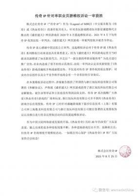 202106-07k1体育信息技术有限公司(以下简称“我司”)于2021年4月取得《传奇》游戏在中国大陆地区的独占性授权。自被授权以来,我司一直积极响应国家知识产权保护政策,始终...